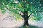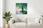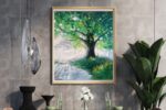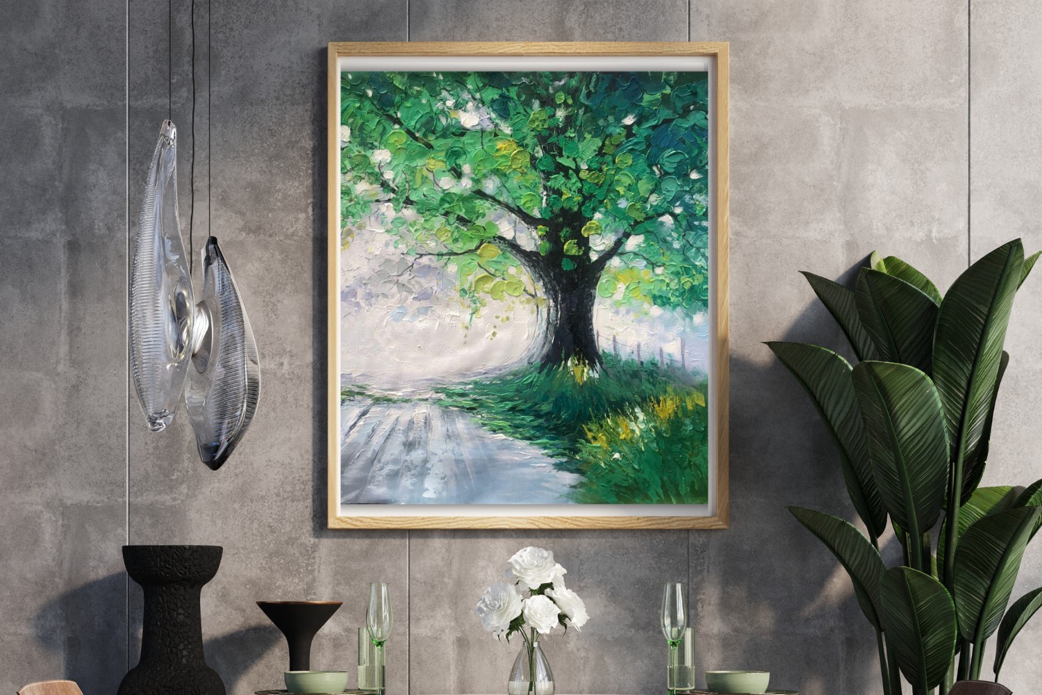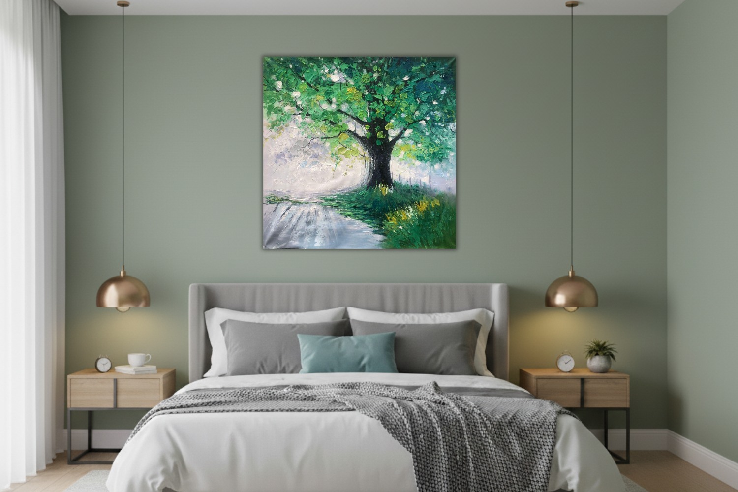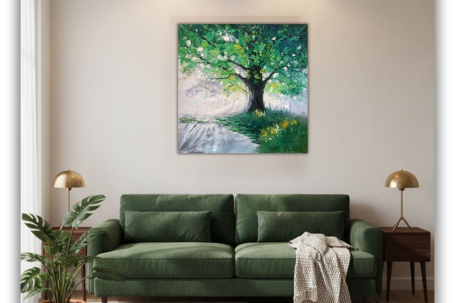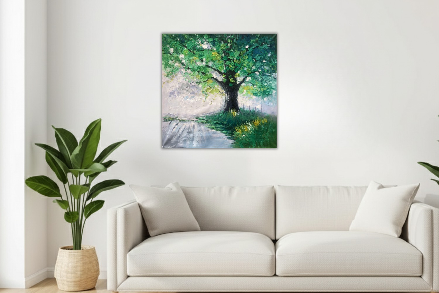 The Guardian Tree captures the timeless beauty and strength of nature through a magnificent tree that stands watch over a quiet countryside path. The artist’s textured brushwork brings depth and vitality to each leaf, blending hues of emerald, yellow, and lime under a soft, glowing sky. Gentle sunlight filters through the dense foliage, casting playful shadows on the ground below. This serene composition symbolizes protection, endurance, and the eternal connection between nature and life’s journey.