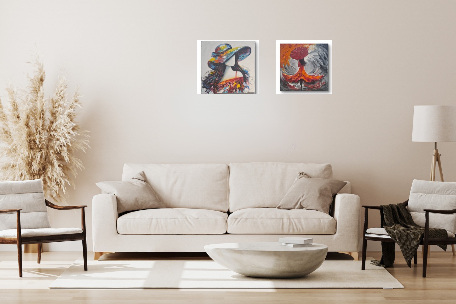 This captivating set of two paintings beautifully celebrates feminine grace, strength, and emotion through color and form.