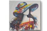 The Lady in the Colorful Hat presents a faceless woman adorned in a vibrant hat and attire, embodying mystery, poise, and artistic elegance.