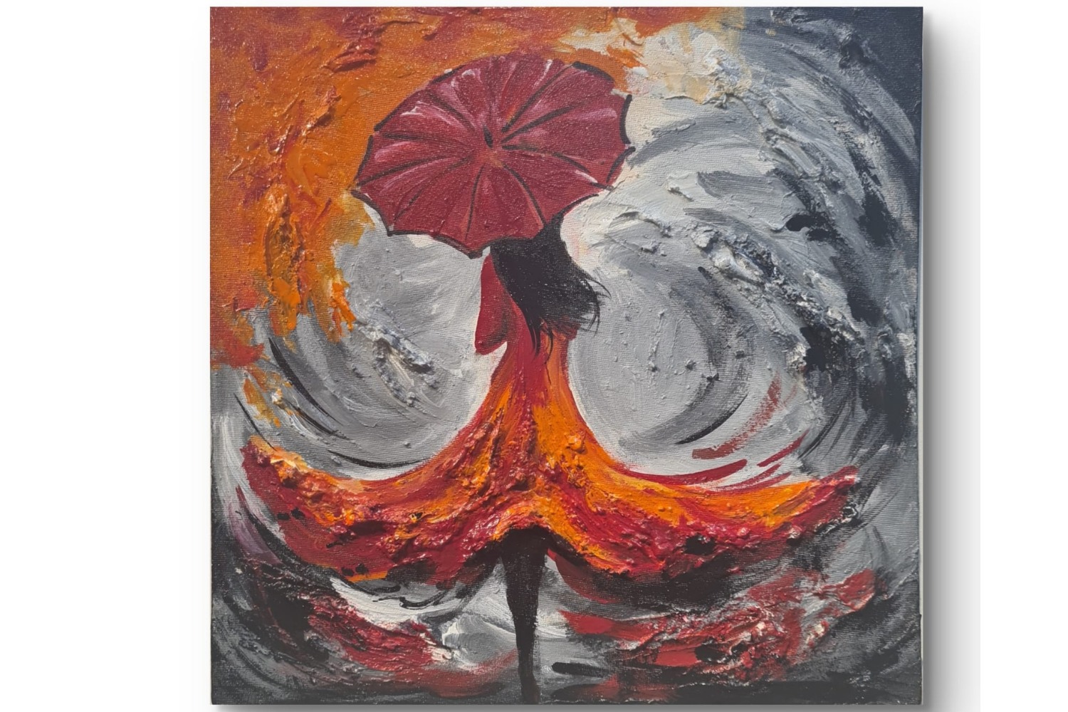 Whirlwind of Emotions portrays a woman standing tall in a swirling storm, her fiery red dress and umbrella symbolizing resilience and passion amidst chaos.