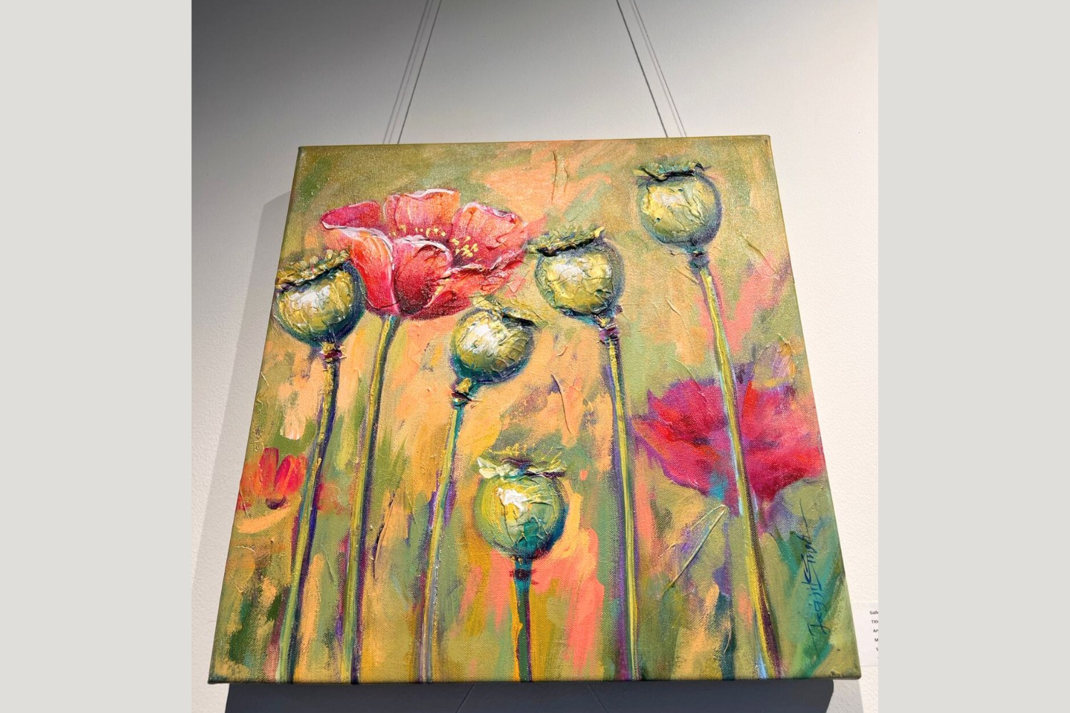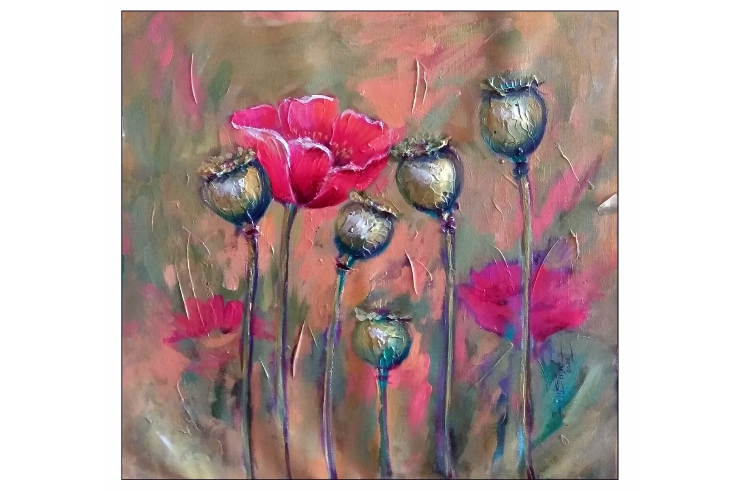 Whispering Dawn Acrylic on canvas — A deep red bloom rests in a soft blend of yellow and muted tones, where light and colour meet to awaken the spirit.