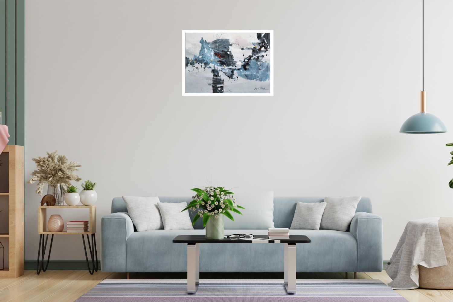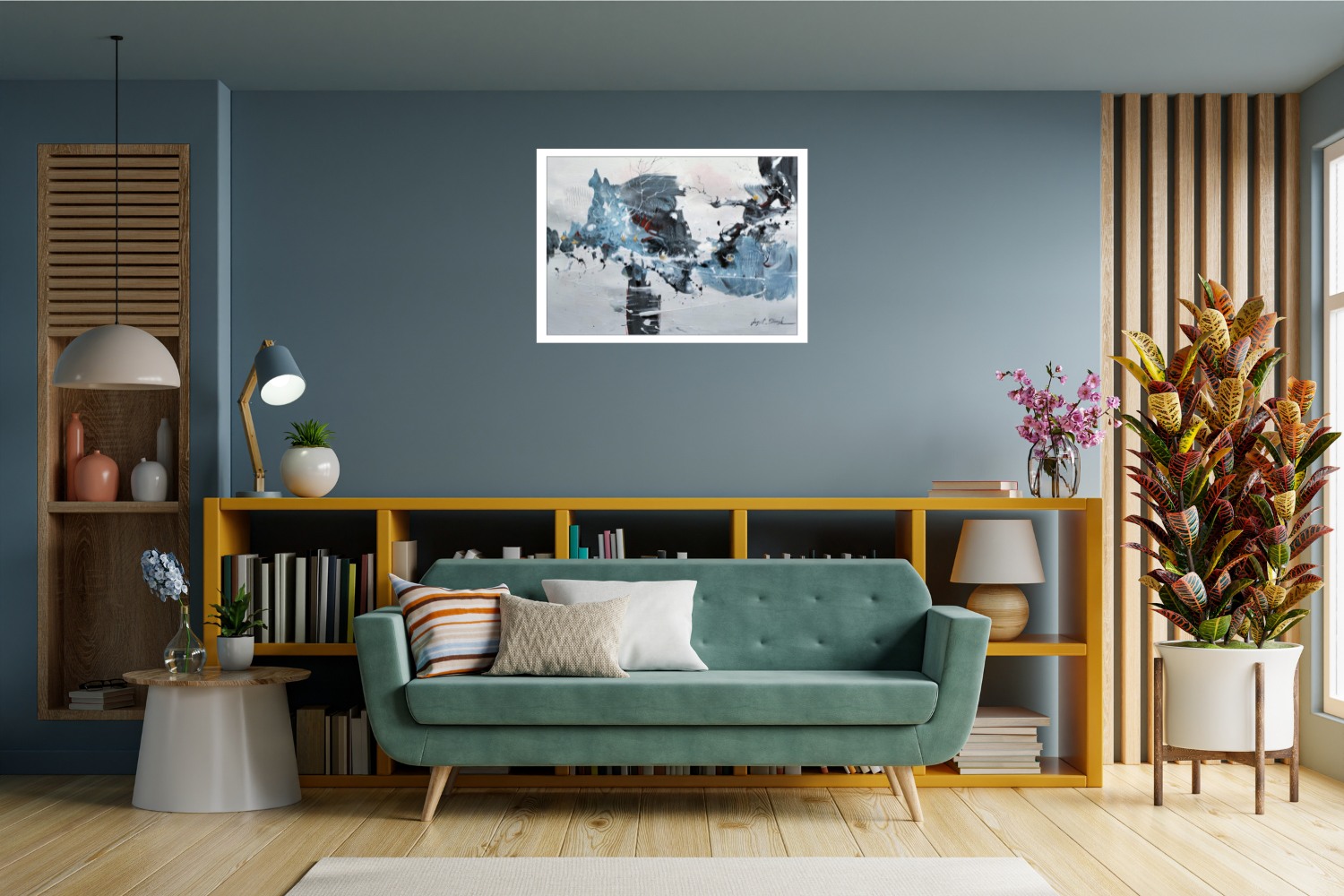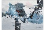 Whispers of the Abstract is a striking contemporary painting that merges fluid motion with bold contrasts. Sweeping strokes of black, white, and blue intertwine with delicate touches of shimmering gold, creating rhythm and energy throughout the composition.